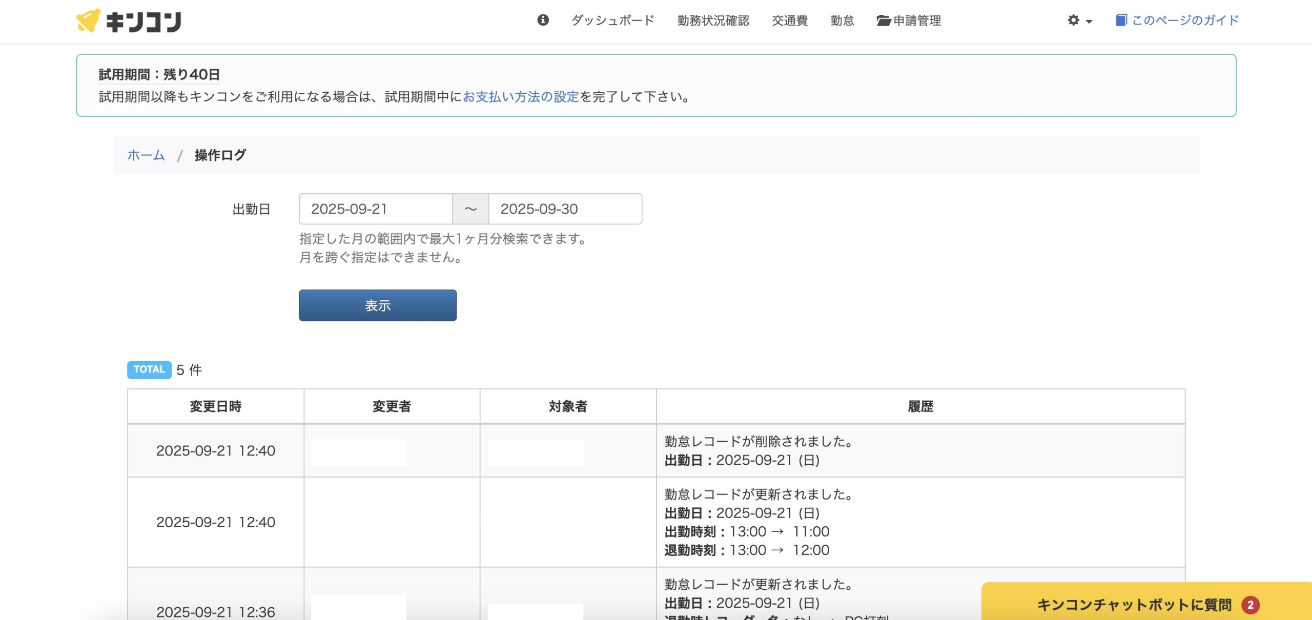 操作ログのページに行けば、全ての従業員のログを一覧で見れるようです。