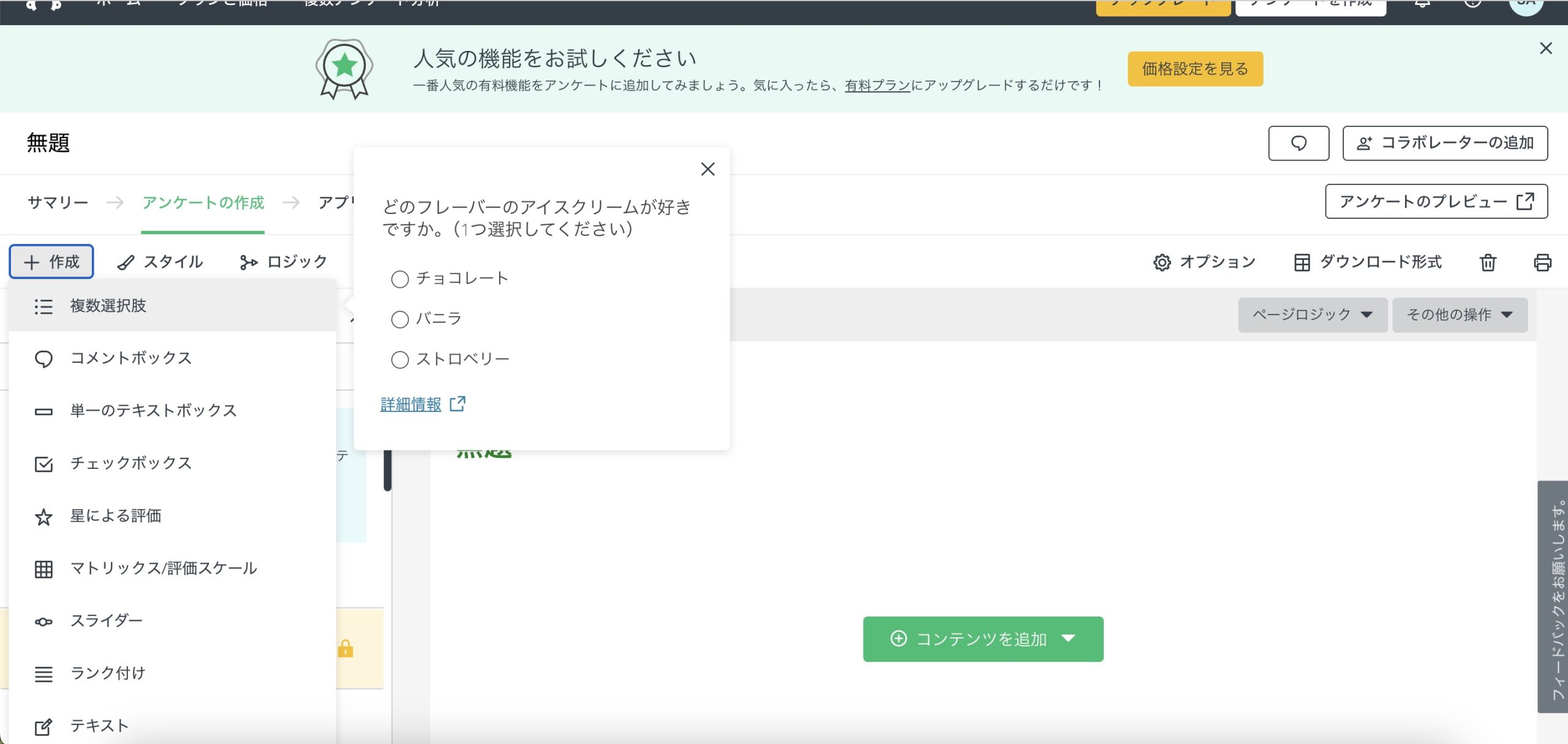 左上の作成ボタンを押すと、様々な回答形式が選べるようでした。