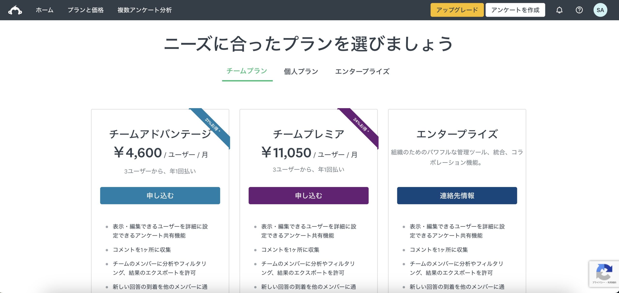 SurveyMonkeyには様々な料金プランがあるようです。チームプラン、個人プラン、エンタープライズなどがあります。