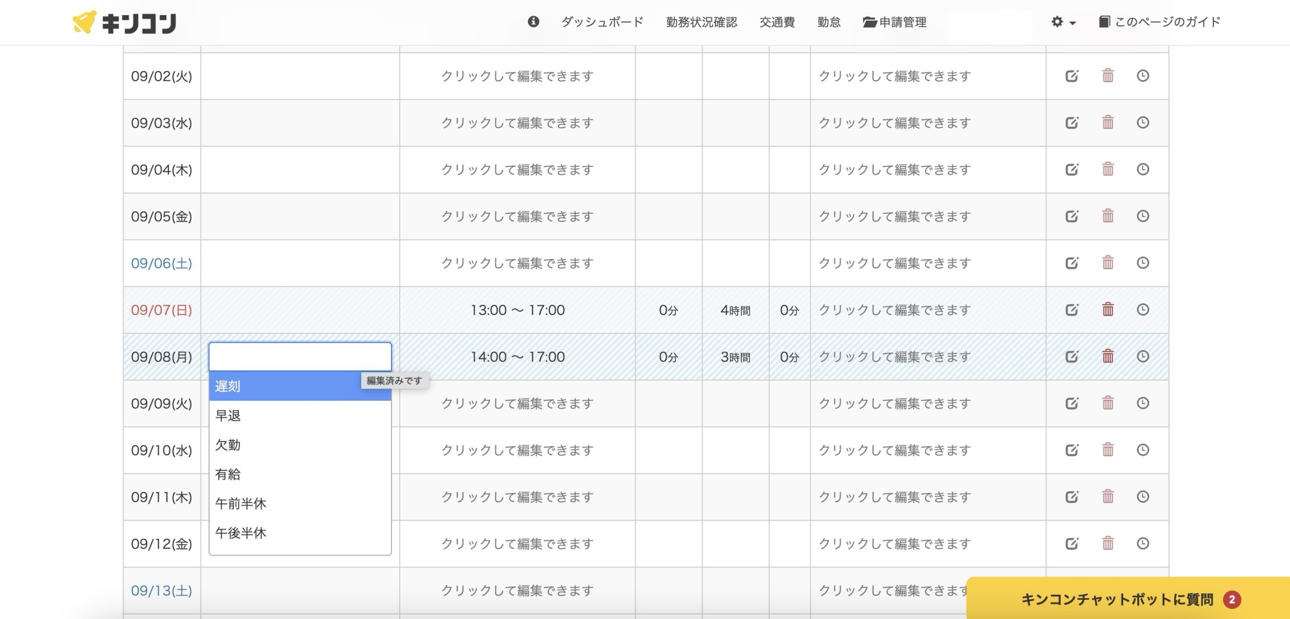 遅刻、早退、有給、半休も選べました。ぱっと見でわかるのでありがたい!