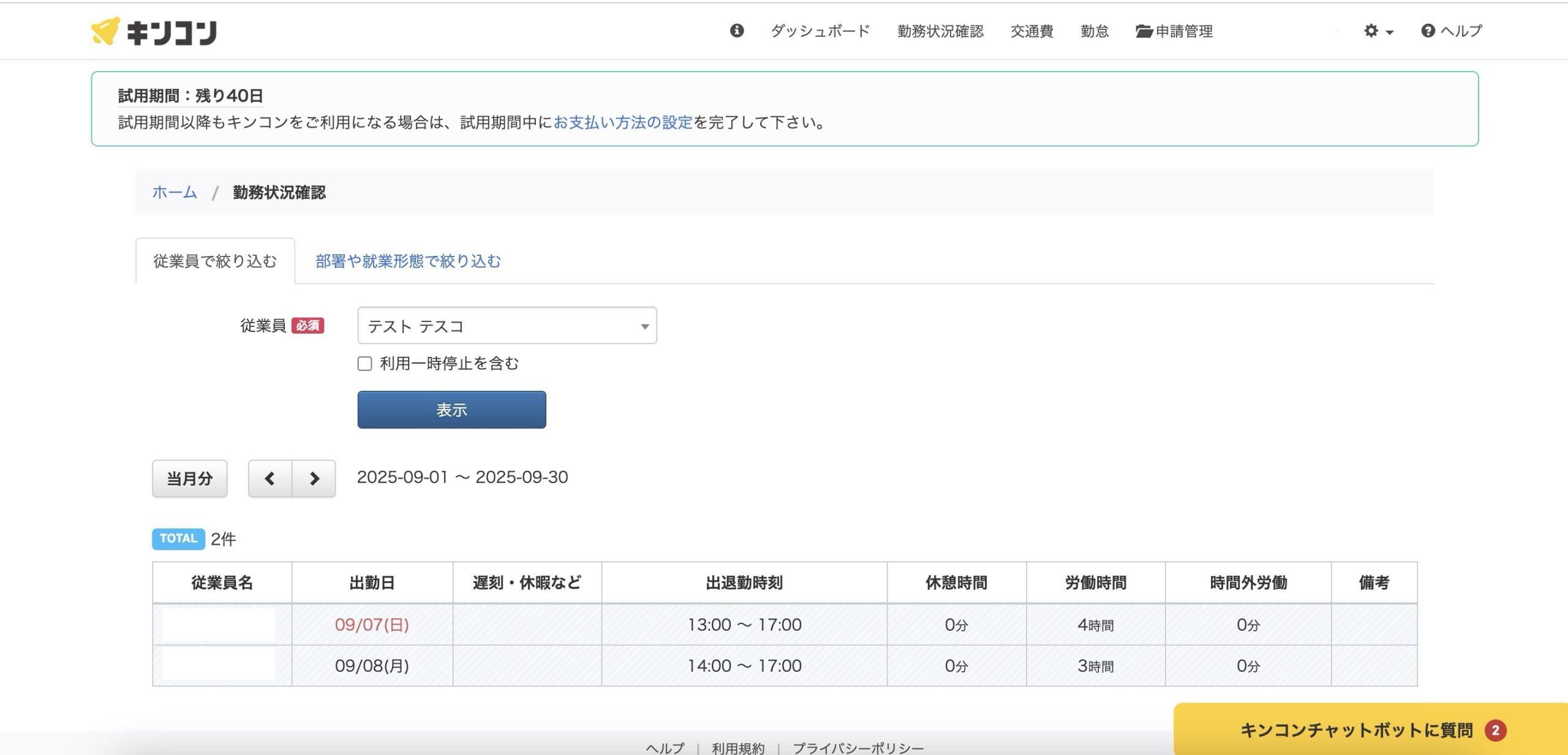 キンコンで勤務状況の確認をしてみた
